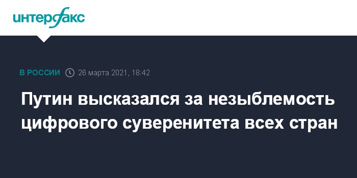 Москва. 26 марта. INTERFAX.RU - Россия призывает к заключению международных договоренностей по предупреждению конфликтов в информационом пространстве, но при этом выступает за незыблемость цифрового суверенитета всех государств, заявил в Совбезе России президент Владимир Путин.