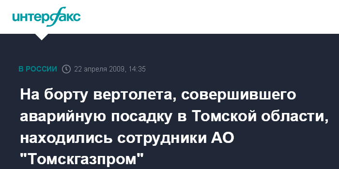 Москва. 22 апреля. INTERFAX.RU - ОАО "Томскгазпром" (дочернее общество ОАО "Востокгазпром") заинтересовано в объективном и обстоятельном расследовании причин и обстоятельств происшествия с вертолетом МИ-2 в Томской области в среду.