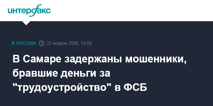 Москва. 22 апреля. INTERFAX.RU - Сотрудники УФСБ РФ по Самарской области задержали двух мошенников, которые обманули семь человек, обещая им за вознаграждение удостоверение чекиста."Задержанные брали деньги, обещая оказать помощь в трудоустройстве в Центральный аппарат ФСБ России в Москве с оформлением служебного удостоверения сотрудника ФСБ. Путем обмана они получили от семи жителей Самары по 70 тысяч рублей с каждого", - сообщает пресс-служба УФСБ по Самарской области.