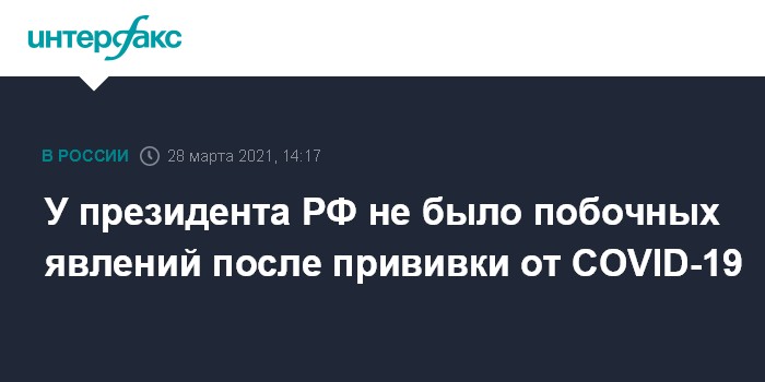 Москва. 28 марта. INTERFAX.RU - Президент РФ Владимир Путин рассказал, что после прививки от коронавируса особых побочных явлений у него не было.