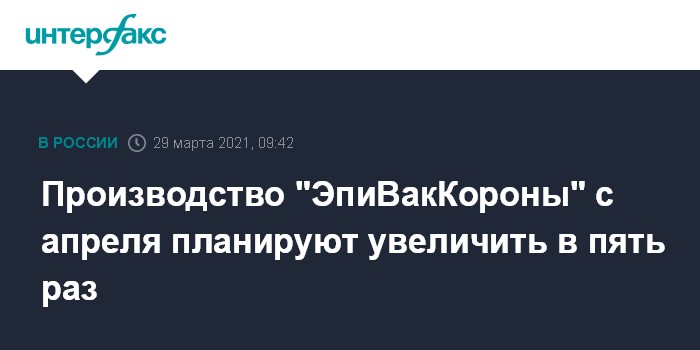 Москва. 29 марта. INTERFAX.RU - Производство вакцины "ЭпиВакКорона" в апреле вырастет до 5 млн доз в месяц, сообщил глава екатеринбургского НИИ вирусных инфекций "Вектор" Роспотребнадзора Александр Семенов.