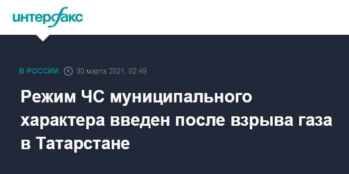 Москва. 30 марта. INTERFAX.RU - Режим чрезвычайной ситуации муниципального характера введен в татарстанском Зеленодольске после взрыва газа в жилом многоквартирном доме, сообщил журналистам начальник ГУ МЧС России по Татарстану Рафис Хабибуллин во вторник.