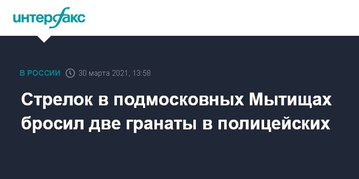 Москва. 30 марта. INTERFAX.RU - Открывший стрельбу в поселке Вешки близ подмосковных Мытищ мужчина бросил две гранаты в сотрудников правоохранительных органов, однако пострадавших нет, сообщила начальник пресс-службы Главного управления МВД России по Московской области Татьяна Петрова.