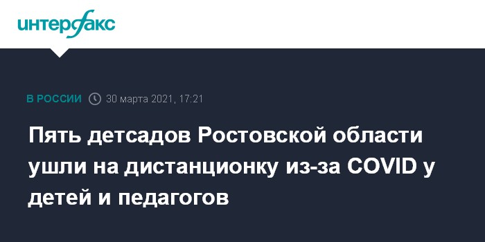 Москва. 30 марта. INTERFAX.RU - За минувшую неделю из-за COVID-19 на дистанционный режим работы переведены пять детских садов в Ростовской области, сообщил во вторник глава Роспотребнадзора региона Евгений Ковалев на заседании оперштаба по коронавирусу.