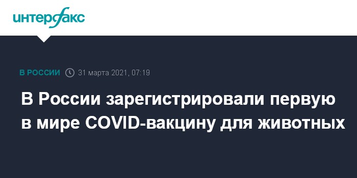 Москва. 31 марта. INTERFAX.RU - Первая в мире вакцина против коронавируса для животных зарегистрирована в России, сообщил журналистам замруководителя Россельхознадзора Константин Савенков.
