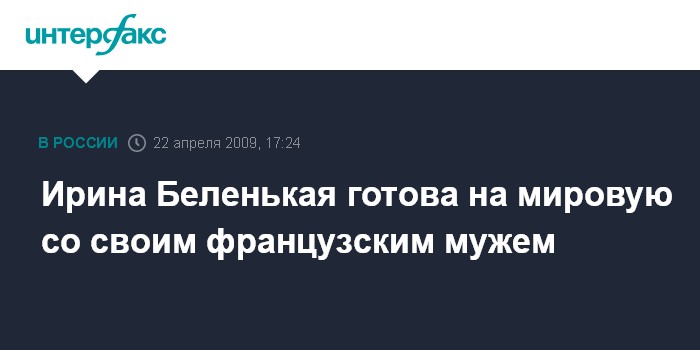 "У меня только что прошла двухчасовая встреча с Ириной Беленькой в изоляторе временного содержания. Она дала согласие подписать мировое соглашение с ее супругом о снятии взаимных претензий", - сказал Кучерена корреспонденту агентства. При этом он не стал уточнять детали будущего мирового соглашения, отметив лишь, что "проект соглашения будет выработан на двусторонней основе - адвокатами с французской и российской стороны".
