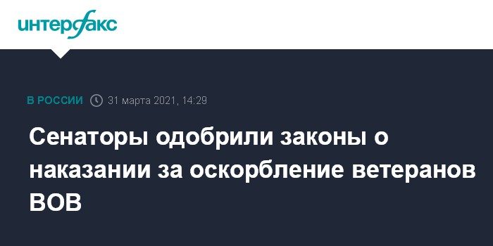 Москва. 31 марта. INTERFAX.RU - Совет Федерации на заседании в среду одобрил законы об административной и уголовной ответственности за публичное унижение чести и достоинства ветеранов ВОВ, а также за распространение заведомо ложных сведений о них.