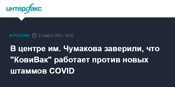 Москва. 31 марта. INTERFAX.RU - Вакцина от COVID-19 "КовиВак" будет эффективна против новых мутаций коронавируса, заявил директор центра имени Чумакова РАН Айдар Ишмухаметов.