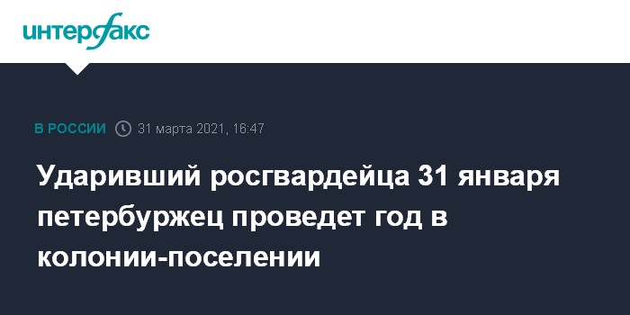 Москва. 31 марта. INTERFAX.RU - В Петербурге Ленинский суд приговорил к году колонии-поселения Евгения Туганкова, который в день несоглсовнаной акции протеста 31 января напал на сотрудника Росгвардии. Об этом сообщила объединенная пресс-служба городских судов.