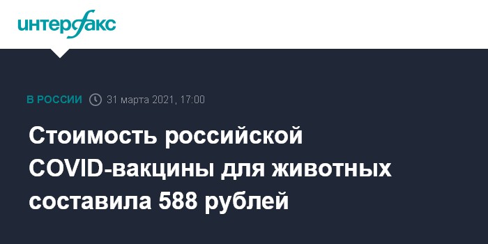 Москва. 31 марта. INTERFAX.RU - Две дозы вакцины против COVID-19 для животных будут стоить 588 рублей, сообщает корпоративное издание Россельхознадзора "Ветеринария и жизнь" со ссылкой на советника руководителя службы Юлию Мелано.