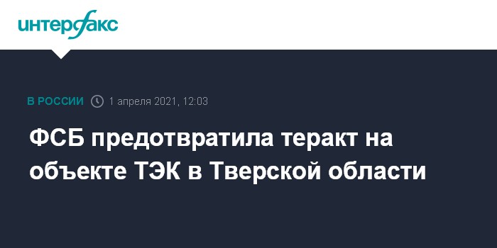 Москва. 1 апреля. INTERFAX.RU - ФСБ сообщает о предотвращении теракта на объекте топливно-энергетического комплекса (ТЭК) в Тверской области, планировавший его пособник террористов из "Исламского государства" (ИГ, организация запрещена в РФ) нейтрализован.