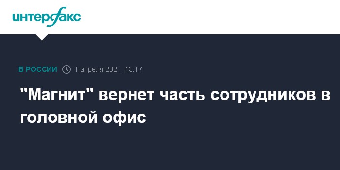 Москва. 1 апреля. INTERFAX.RU - Ритейлер "Магнит" с 1 апреля возвращает в офис часть сотрудников головной компании в Краснодаре. Для остальных сотрудников будут предложены гибридный и полностью дистанционный режимы работы, говорится в сообщении компании.