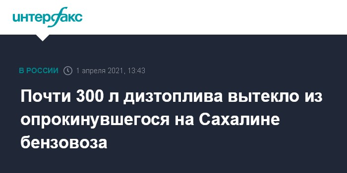 Москва. 1 апреля. INTERFAX.RU - Сотни литров дизтоплива вытекли из бензовоза, опрокинувшегося в кювет утром в четверг в Углегорском районе Сахалинской области, сообщает пресс-служба правительства региона.