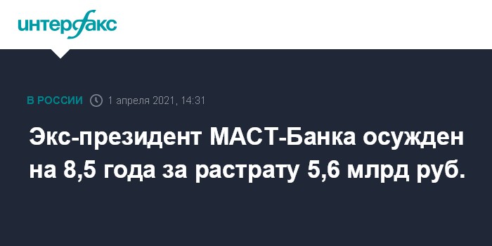 Экс-президент МАСТ-Банка осужден на 8,5 года за растрату 5,6 млрд руб.