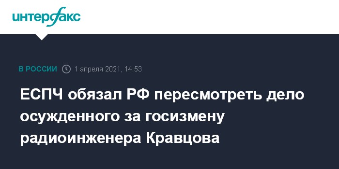Москва. 1 апреля. INTERFAX.RU - Европейский суд по правам человека вынес решение, согласно которому российские суды должны пересмотреть дело бывшего сотрудника Главного управления Генштаба (ГРУ), радиоинженера Геннадия Кравцова, осужденного за госизмену, сообщили "Интерфаксу" в правозащитном объединении "Команда 29".