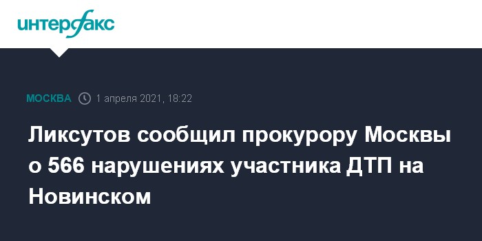 Москва. 1 апреля. INTERFAX.RU - Заммэра по вопросам транспорта Максим Ликсутов в письме прокурору Москвы Денису Попову сообщил, что у участника резонансного ДТП на Новинском бульваре, по данным Дептранса города, больше 566 нарушений дорожного движения. Об этом сообщила пресс-служба департамента.
