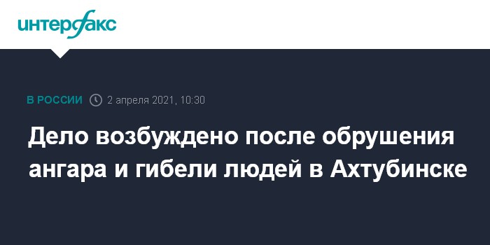 Москва. 2 апреля. INTERFAX.RU - В связи с гибелью двух человек при обрушении самолетного ангара в Ахтубинске возбуждено уголовное дело, сообщили в управлении СК по Астраханской области. Дело завели на гендиректора фирмы-подрядчика, которая разбирала этот ангар, расположенный в воинской части №15650.