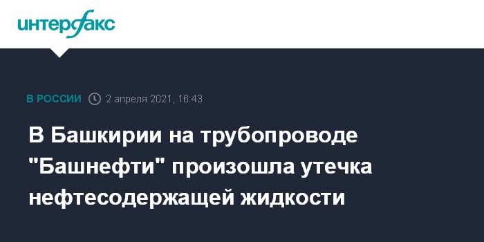 Как сообщили "Интерфаксу" в "Башнефти", 1 апреля оперативно ликвидирован отказ трубопровода на Шкаповском месторождении (Бижбулякский район Башкирии). Вышедший незначительный объем нефтесодержащей жидкости локализован. В компании также заверили, что угрозы попадания нефтесодержащей жидкости в водоемы нет.