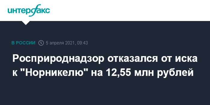 Москва. 5 апреля. INTERFAX.RU - Росприроднадзор отказался от иска к "Норникелю" на 12,55 млн рублей, поскольку компания добровольно возместила этот ущерб, нанесенный тундре летом из-з сброса сточных вод из хвостохранилища Талнахской обогатительной фабрики (ТОФ).