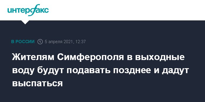 Вице-премьер также сказала, что жители Симферополя попросили в выходные и праздники подавать в дома воду не с 6 утра, а с 8. Глава Крыма Сергей Аксенов решил изменить график работы водопровода с 10 апреля. С этого дня в выходные и праздники воду будут подавать с 8 до 11 утра и с 18 до 21 часа.