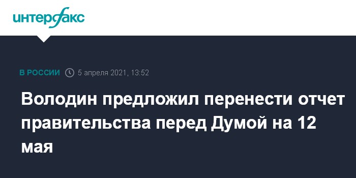 Москва. 5 апреля. INTERFAX.RU - Правительство попросило Госдуму перенести отчет министров о работе за 2020 год с 21 апреля на другой день, поскольку в эту дату президент Владимир Путин решил огласить послание Федеральному Собранию. Об этом сообщил пресс-секретарь премьера Борис Беляков. Спикер Думы Вячеслав Володин предложил перенести его на 12 мая.