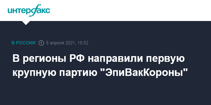 "Первая крупная партия вакцины "ЭпиВакКорона" направлена в регионы 5 апреля, более 230 тысяч комплектов вакцины "ЭпиВакКорона" направлены в более чем 40 субъектов РФ", - сообщила пресс-служба Роспотребнадзора в понедельник.