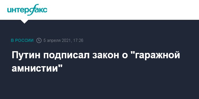 Москва. 5 апреля. INTERFAX.RU - Президент РФ Владимир Путин в понедельник подписал закон о "гаражной амнистии". Документ опубликован на официальном интернет-портале правовой информации.