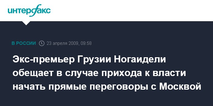 Москва. 23 апреля. INTERFAX.RU - Лидер оппозиционного движения "За справедливую Грузию", бывший премьер-министр Зураб Ногаидели обещает в случае прихода к власти начать прямые переговоры с Россией.