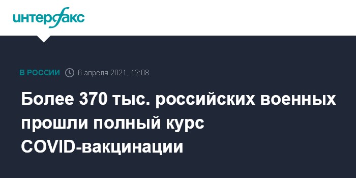 Москва. 6 апреля. INTERFAX.RU - Полный курс прививок от коронавирусной инфекции COVID-19 прошли более 370 тысяч российских военнослужащих, сообщил во вторник министр обороны РФ Сергей Шойгу.