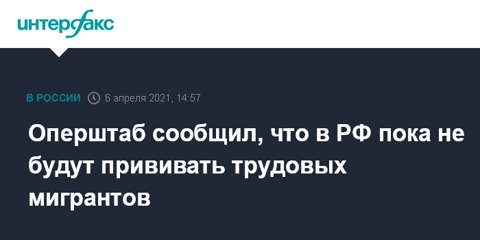 Так в оперштабе ответили на вопрос, планируется ли вакцинация трудовых мигрантов и работающих в РФ иностранцев, чтобы не допустить нового роста заболеваемости COVID-19.