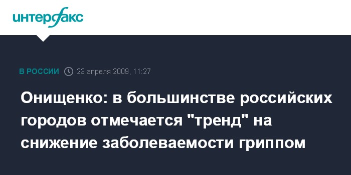Главный санитарный врач отметил, что в большинстве наблюдаемых городов отмечается "тренд на снижение". Он указал на то, что в целом в РФ в сезоне 2008 - 2009 продолжительность эпидемии составляла 13 недель.