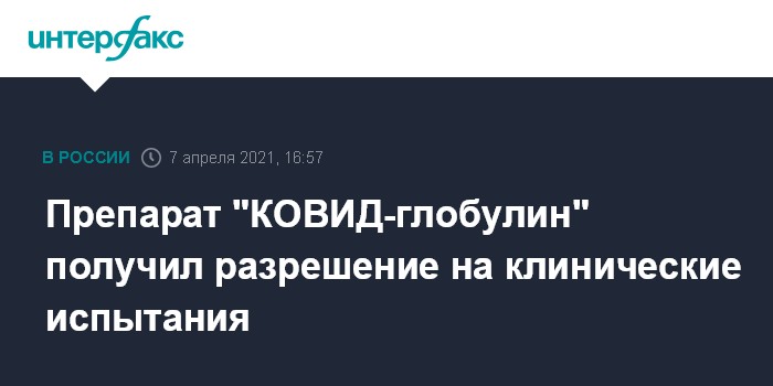 Москва. 7 апреля. INTERFAX.RU - Препарат специфического иммуноглобулина для лечения коронавируса "КОВИД-глобулин" 2 апреля получил разрешение на проведение клинических испытаний, сообщили "Интерфаксу" в столичном департаменте здравоохранения.