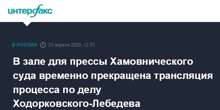 Москва. 23 апреля. INTERFAX.RU - Хамовнический суд Москвы прекратил трансляцию второго судебного процесса в отношении экс-главы НК "ЮКОС" Михаила Ходорковского и бывшего главы МФО "Менатеп" Платона Лебедева, которая осуществлялась в зале для прессы.
