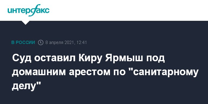 Москва. 8 апреля. INTERFAX.RU - Мосгорсуд оставил без изменений решение Басманного суда продлить домашний арест до 23 июня пресс-секретарю Алексея Навального Кире Ярмыш по делу о подстрекательстве к нарушению санитарно-эпидемиологических правил на акции 23 января в Москве, сообщили в пресс-службе суда.