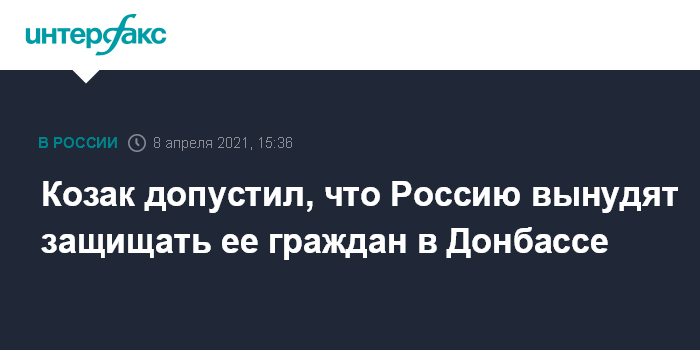 Москва. 8 апреля. INTERFAX.RU - Замруководителя администрации президента России Дмитрий Козак допустил, что Россию могут вынудить защищать своих граждан в Донбассе. Он сказал это на сессии совместного проекта ИМЭМО имени Е.М.Примакова РАН и группы "Интерфакс" "Россия и мир: профессиональный разговор".