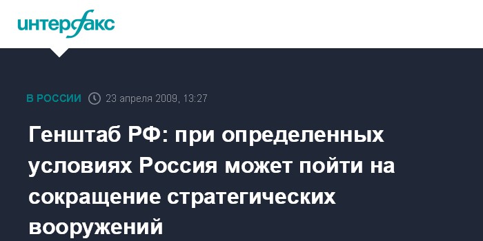 Москва. 23 апреля. INTERFAX.RU - Россия может значительно сократить стратегические наступательные вооружения при условии достижения взаимоприемлемой договоренности с США, заявил начальник Генерального штаба Вооруженных Сил РФ Николай Макаров.