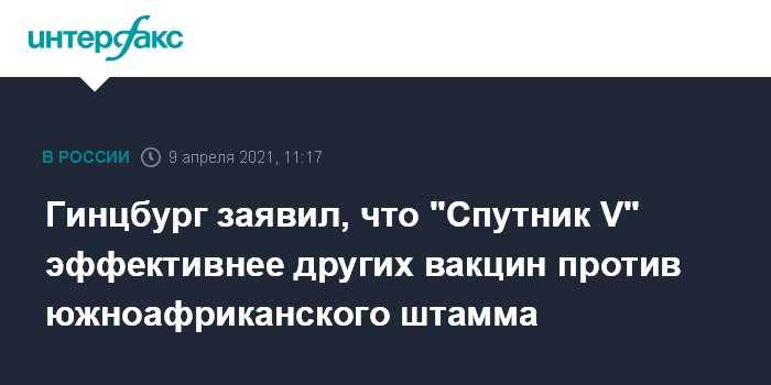 Москва. 9 апреля. INTERFAX.RU - Российский препарат от коронавируса "Спутник V" более эффективен против "южноафриканского" штамма, чем другие вакцины, сообщил глава центра им. Гамалеи Александр Гинцбург в интервью "Интерфаксу".