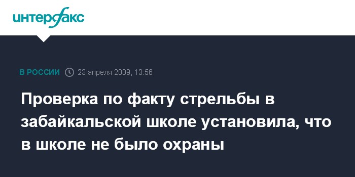 Москва. 23 апреля. INTERFAX.RU - Средняя школа №1 города Шилка Забайкальского края 13 марта, когда местный пьяница устроил там стрельбу, никем не охранялась. "Охранника школы не оказалось на рабочем месте в момент появления злоумышленника", - сообщает пресс-служба УФСБ РФ по Забайкальскому краю.