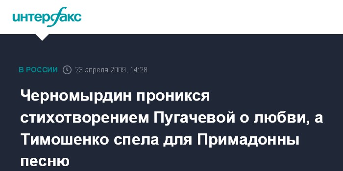 Черномырдин вспомнил, как А.Пугачева в ходе выступлений прочла стихотворение про любовь. "И так эмоционально она это сделала! Как она потом объяснила, все ее песни - про любовь, и в основном, написанные во сне. Так вот, рядом сидела Юлия Владимировна (премьер-министр Украины Юлия Тимошенко - ИФ) и я говорю ей: ты представляешь, какие у нее сны? И Пугачева прочла: "Любовь это дура, ох и дура эта любовь!". И обязательно при встрече ей скажу, что может любовь и дура, но кто тогда мы, если миллионы людей её любят?".