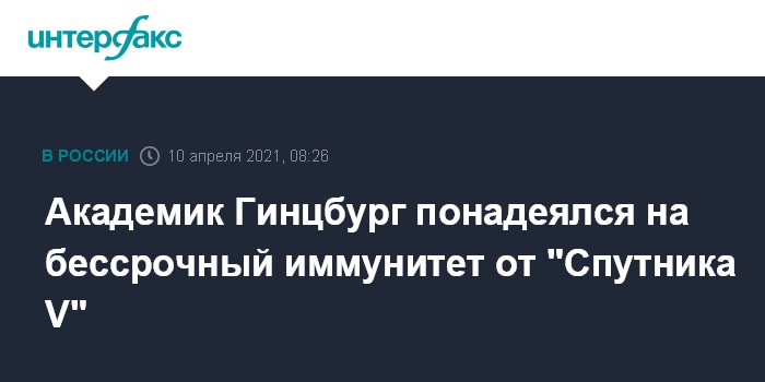 Москва. 10 апреля. INTERFAX.RU - Глава центра имени Гамалеи Александр Гинцбург рассчитывает, что действие российской вакцины от коронавируса "Спутник V" будет бессрочным.
