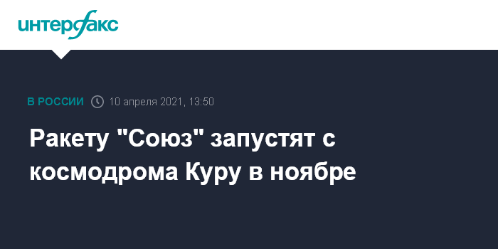 Москва. 10 апреля. INTERFAX.RU - В ноябре 2021 года на космодроме Куру во Французской Гвиане пройдет пуск российской ракеты "Союз", сообщил гендиректор Центра эксплуатации объектов наземной космической инфраструктуры Руслан Мухамеджанов.