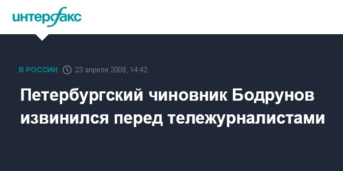 Москва. 23 апреля. INTERFAX.RU - Председатель комитета экономического развития, промышленной политики и торговли Петербурга Сергей Бодрунов принес официальные извинения тележурналистам за некорректные высказывания после одного из эфиров. "Приношу за это свои официальные извинения сотрудникам программы "Петербургский час" и надеюсь на понимание всего журналистского сообщества Санкт-Петербурга", - говорится в официальном заявлении Бодрунова, размещенном на сайте комитета.