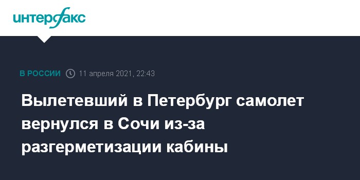 Москва. 11 апреля. INTERFAX.RU - Авиалайнер, направлявшийся из Сочи в Санкт-Петербург, вернулся в аэропорт вылета из-за разгерметизации кабины, сообщили "Интерфаксу" в пресс-службе аэропорта Сочи в воскресенье.