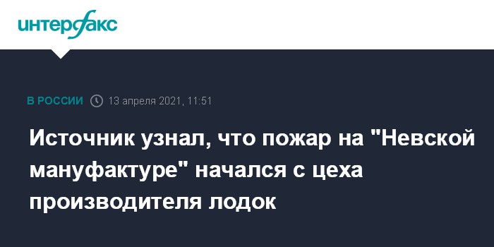 Москва. 13 апреля. INTERFAX.RU - Причина пожара, уничтожившего "Невскую мануфактуру", не установлена, но известно, что возгорание началось в помещении компании, выпускавшей лодки из ПВХ, сообщил "Интерфаксу" информированный источник.