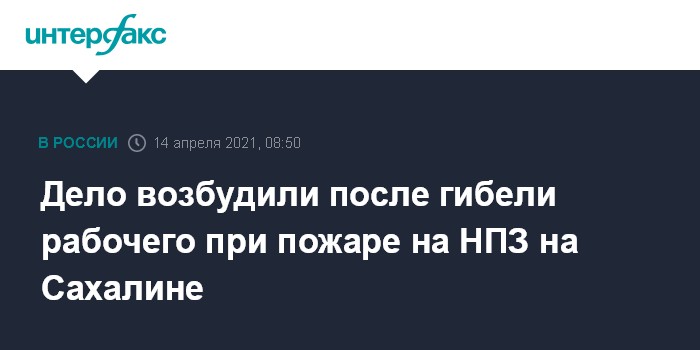 Москва. 14 апреля. INTERFAX.RU - Уголовное дело по факту возгорания на нефтеперерабатывающем заводе АО "Петросах", в результате которого погиб сотрудник предприятия, возбудили следователи. Об этом сообщает пресс-служба Следственного управления (СУ) СКР по Сахалинской области в среду.