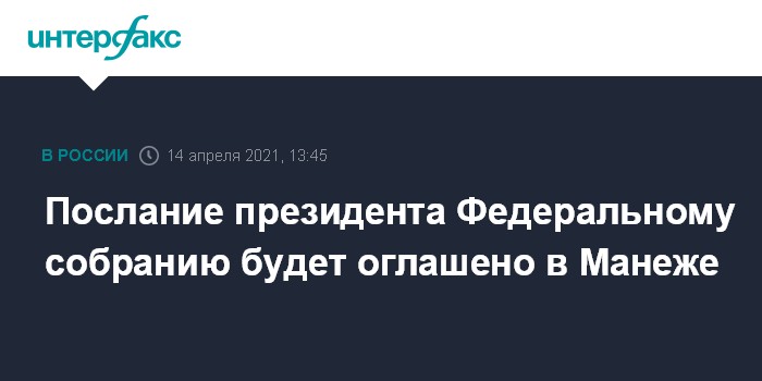 "Заслушивание послания президента РФ Федеральному Собранию состоится, как вы знаете, 21 апреля 2021 года в 12 часов в Центральном выставочном зале "Манеж", - сказал Яцкин сенаторам, закрывая заседание Совета Федерации в среду.