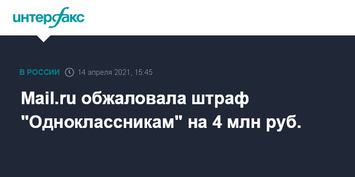 Москва. 14 апреля. INTERFAX.RU - Компания Mail.ru подала апелляционные жалобы на штрафы в 4 млн рублей из-за неудаления принадлежащей ей соцсетью "Одноклассники" запрещенного контента, связанного с призывами к несовершеннолетним участвовать в несогласованных акциях.