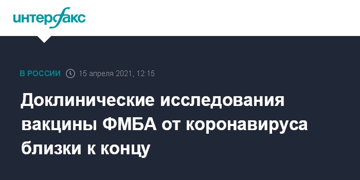 Москва. 15 апреля. INTERFAX.RU - Доклинические испытания вакцины от коронавируса Федерального медико-биологического агентства завершаются, заявила глава ФМБА Вероника Скворцова.
