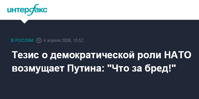 Бухарест. 4 апреля. INTERFAX.RU - Президент РФ Владимир Путин назвал "бредом" утверждения о том, что расширение НАТО автоматически означает и расширение демократического пространства в Европе.