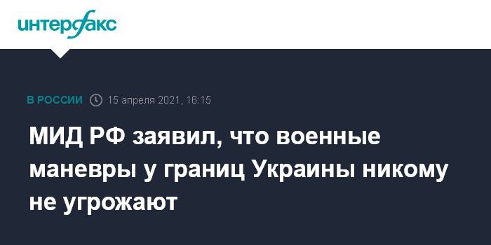 Москва. 15 апреля. INTERFAX.RU - Россия призывает не рассматривать маневры Вооруженных сил России вблизи границы с Украиной как проявление агрессии, они никому не угрожают, заявила официальный представитель МИД РФ Мария Захарова.